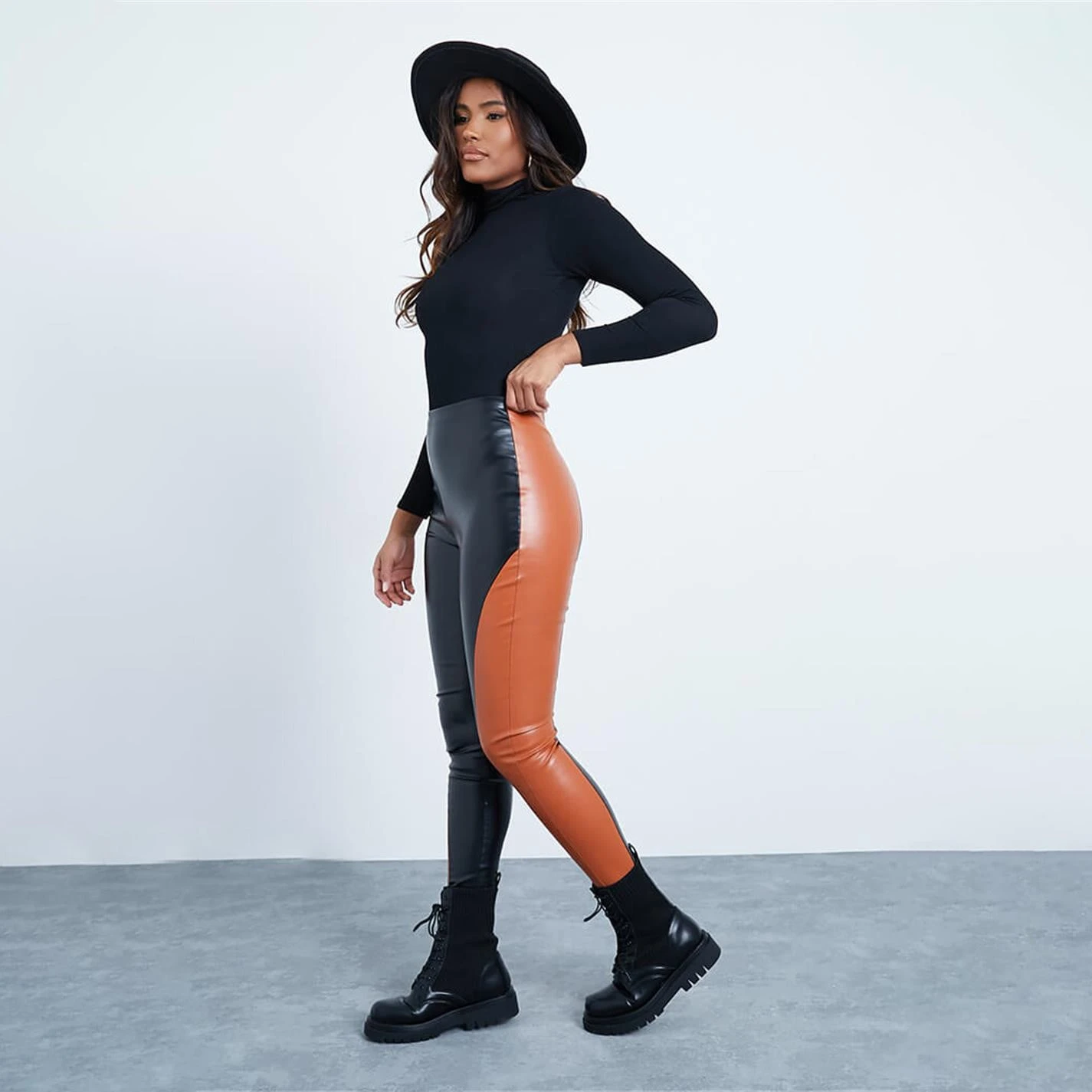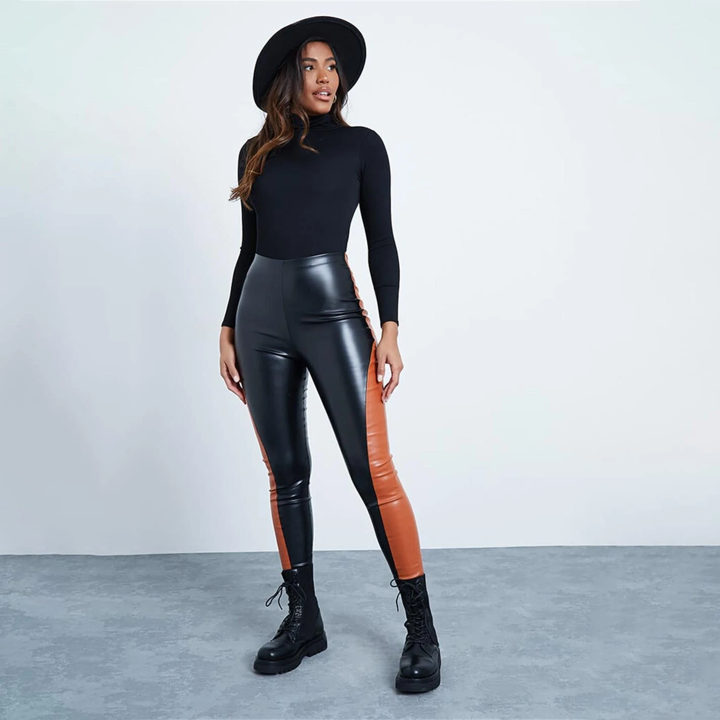 Trousers in a pu faux leather finish, featuring a colour block detail in a high waist fit.