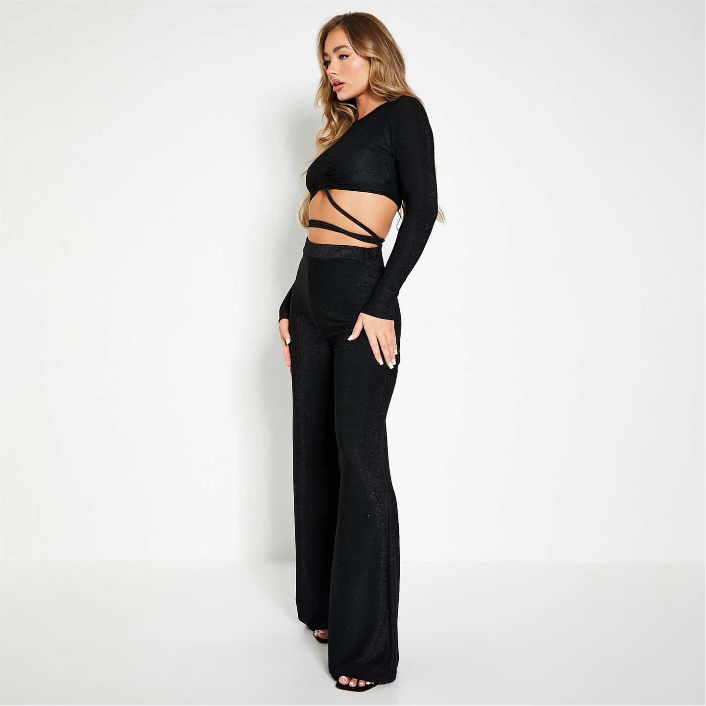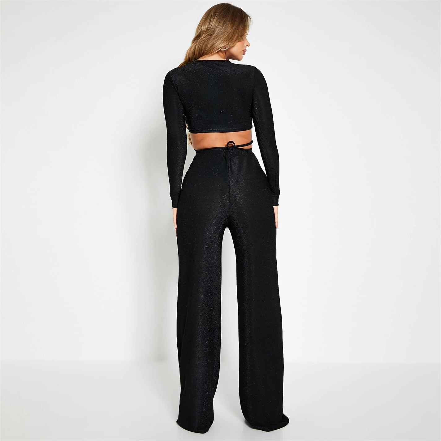 high waisted wide leg trousers with glitter metallic look finish.